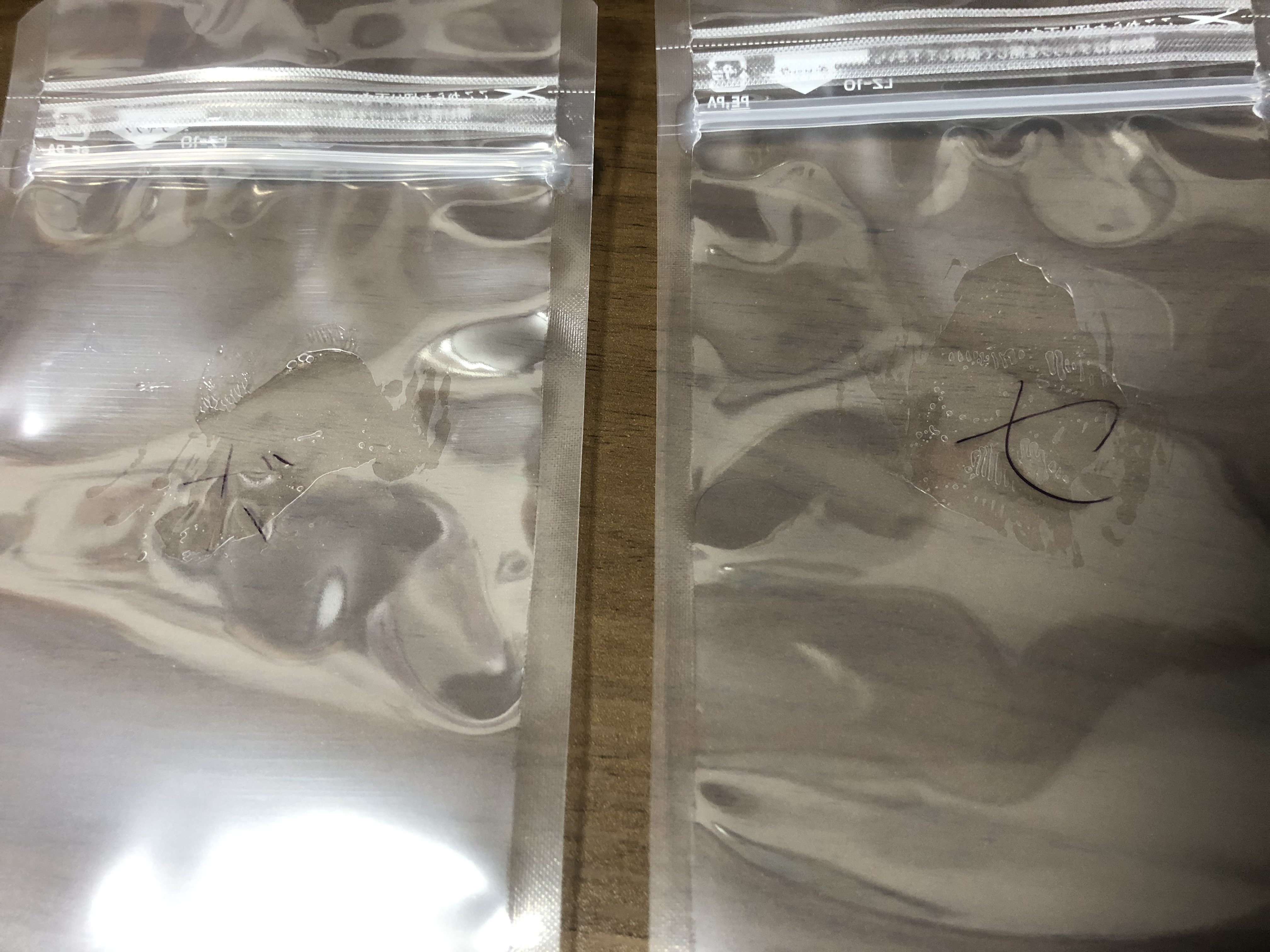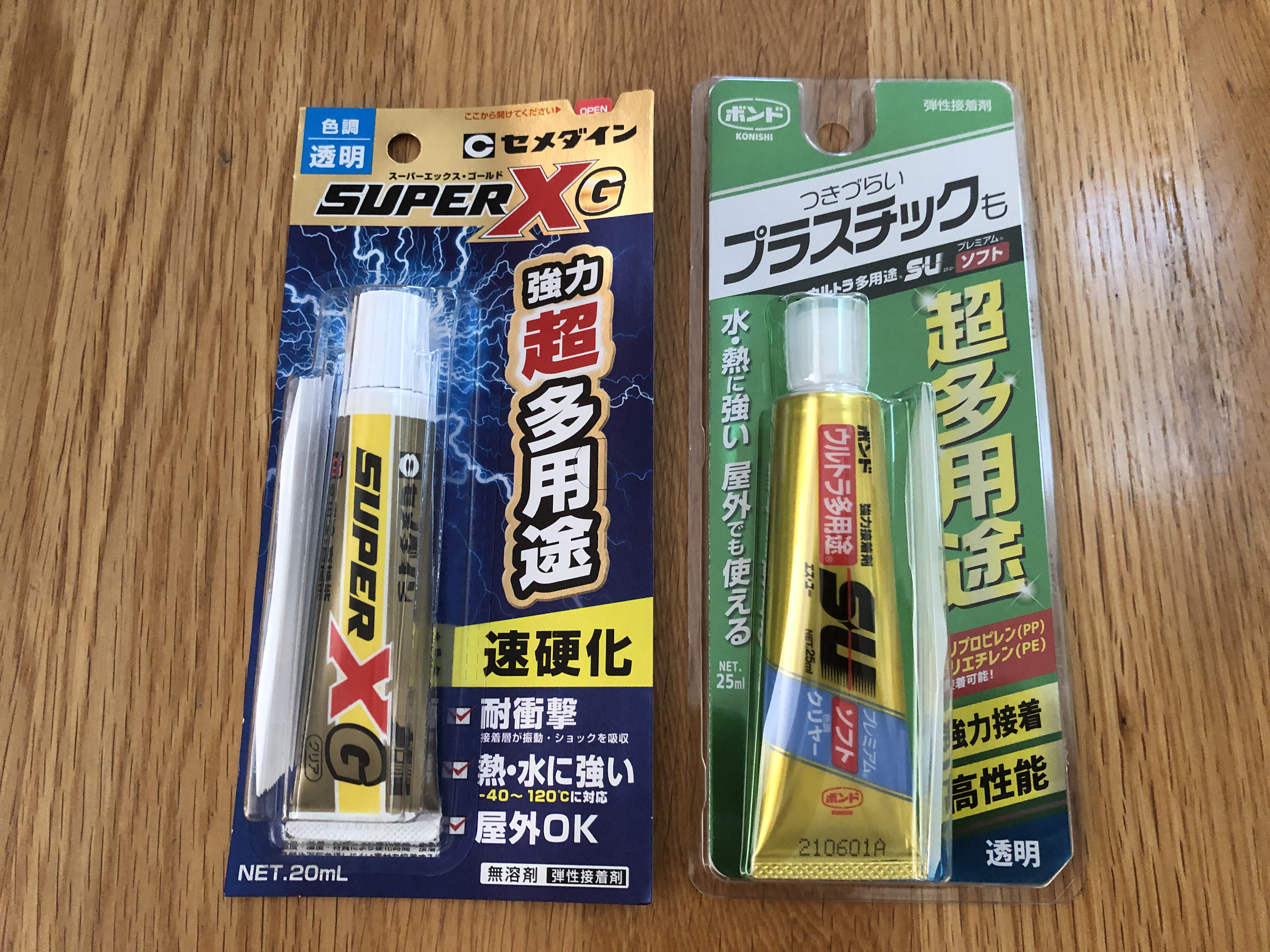 写真左側が「セメダインsuperX」でこちらはナイロンに対応しているがポリエチレンは接着できない。そして右側が「ボンドウルトラ多用途SU」でこちらはポリエチレンを接着できる。ナイロンは記載がないので不明。この二種類をラミジップの適当な部分に塗って接着具合やその強度を確かめる。
