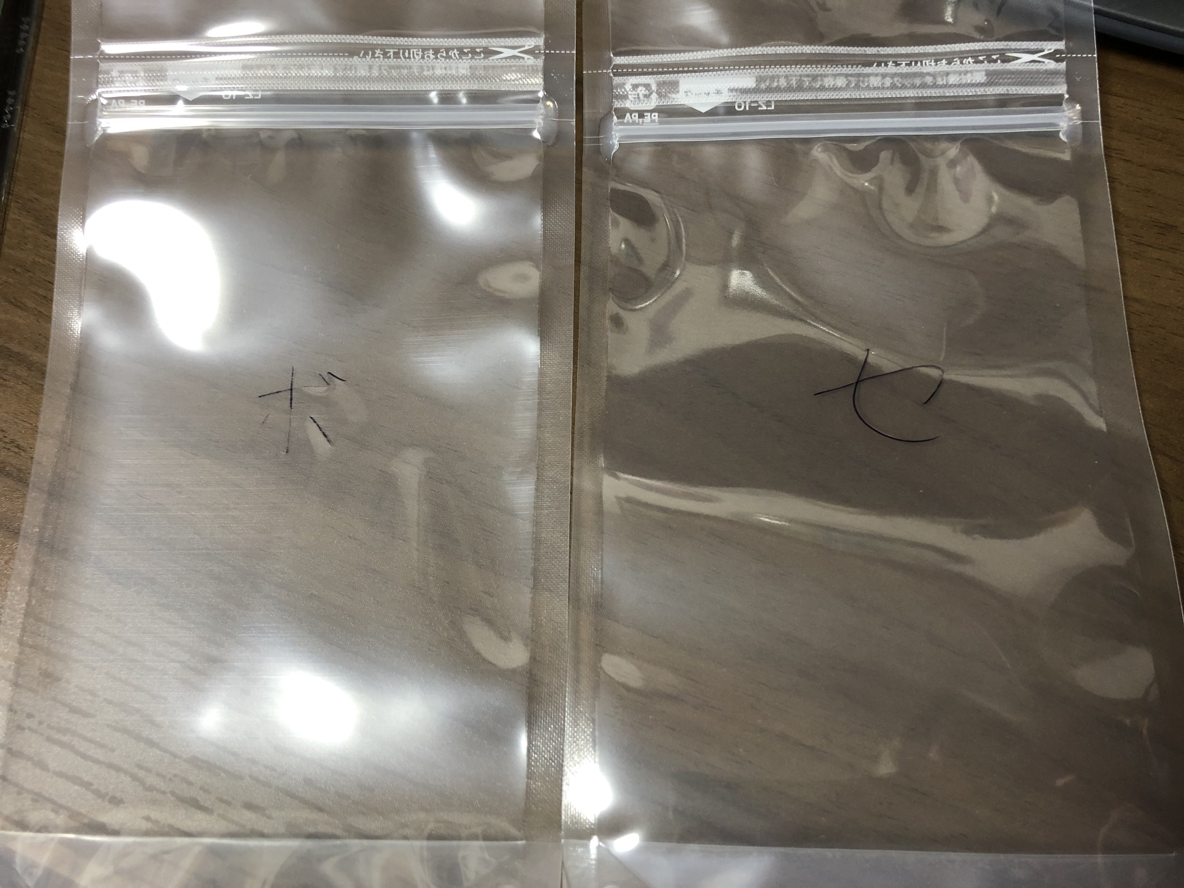 分かりやすいようにセメダインを塗った方に「セ」、ボンドを塗った方に「ボ」とそれぞれ袋に印を付けて接着剤を塗布した。